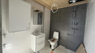 Mallihuoneen kylpyhuone saatiin muutamaa pinta-asennusta vaille valmiiksi.