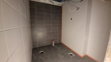 Laatoittajat jatkavat 5. kerroksessa vedeneristyksillä. 3. ja 4. kerroksen laatoitukset on saatu valmiiksi.