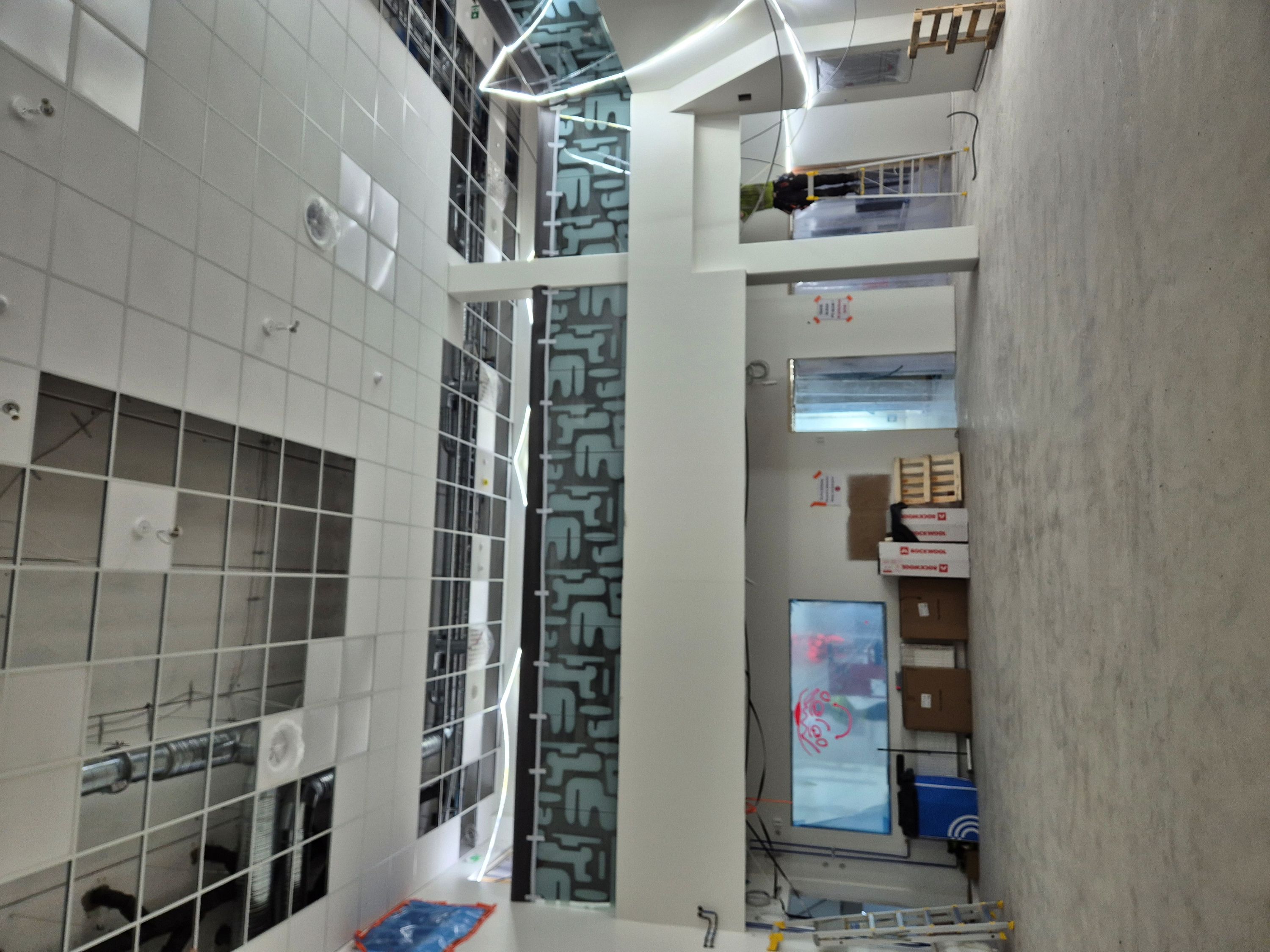 Aulan lasikaiteet on asennettu ja suojattu. Lasikaiteeseen asennettu digiprinttinä vanhan terveysaseman taiteellisia kuvioita.