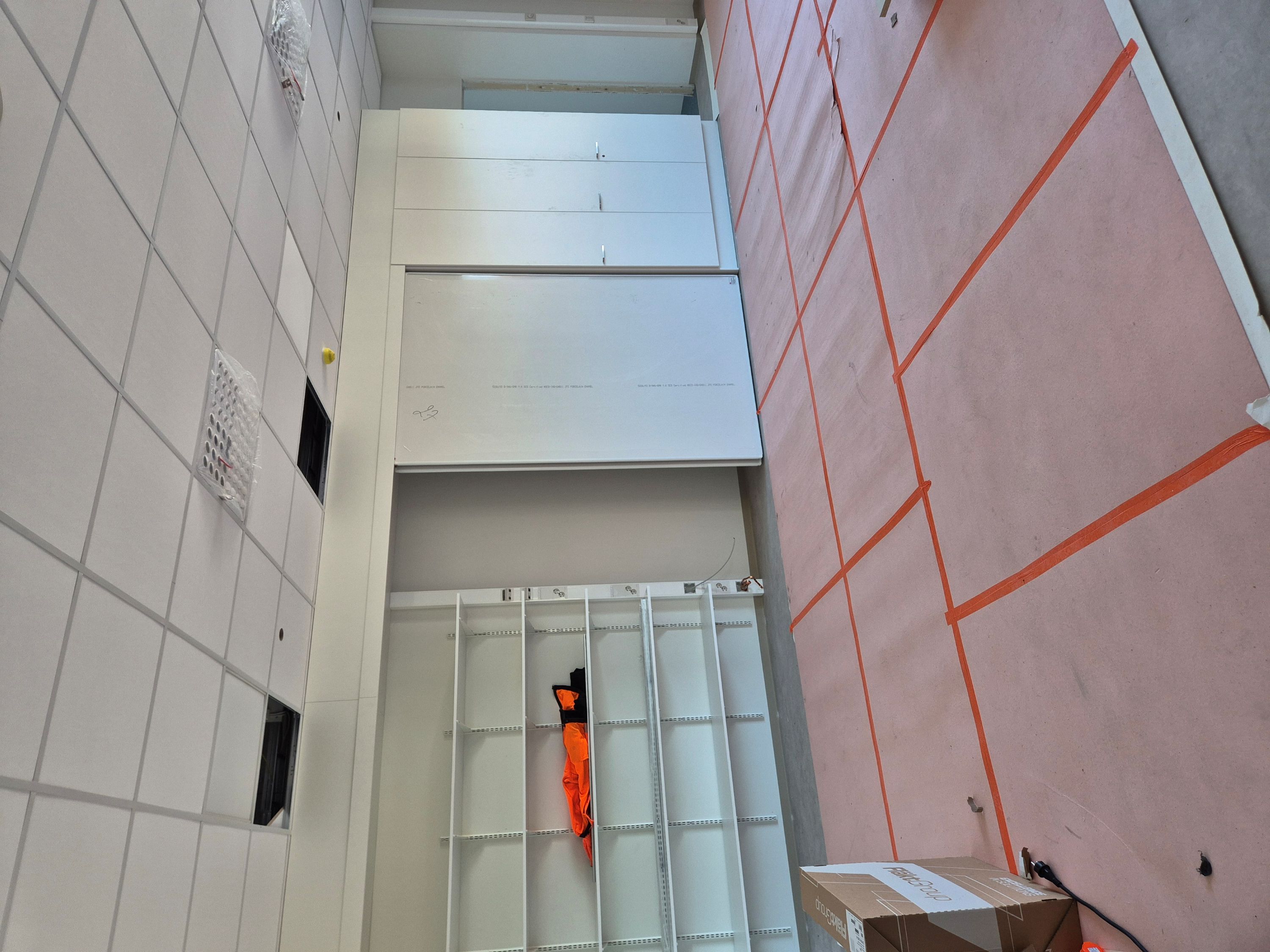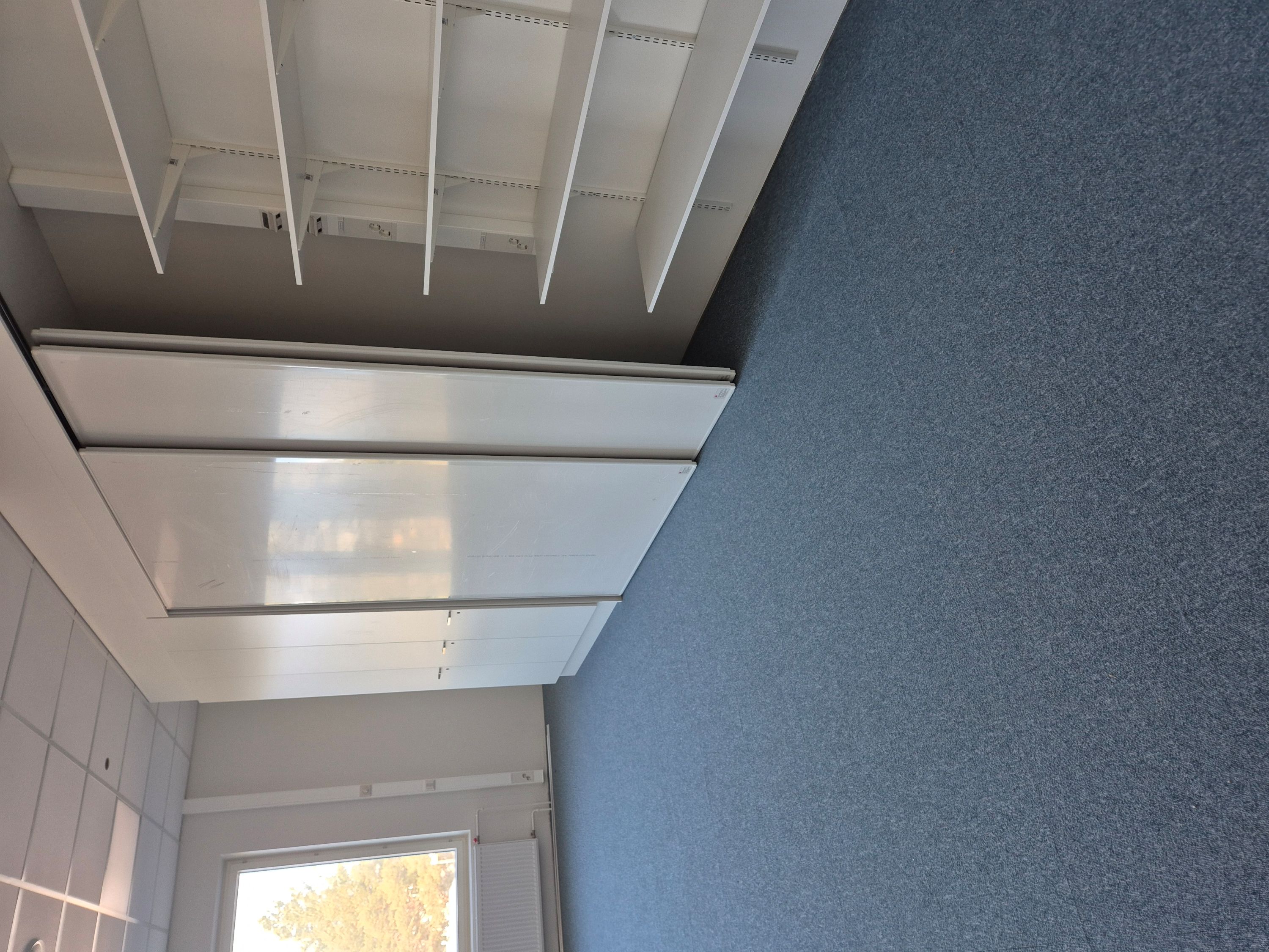 Luokkahuoneisiin tulee suuret tussitaulupintaiset liukuovikaapistot joiden taakse tulee näytöt ja hyllytilaa.