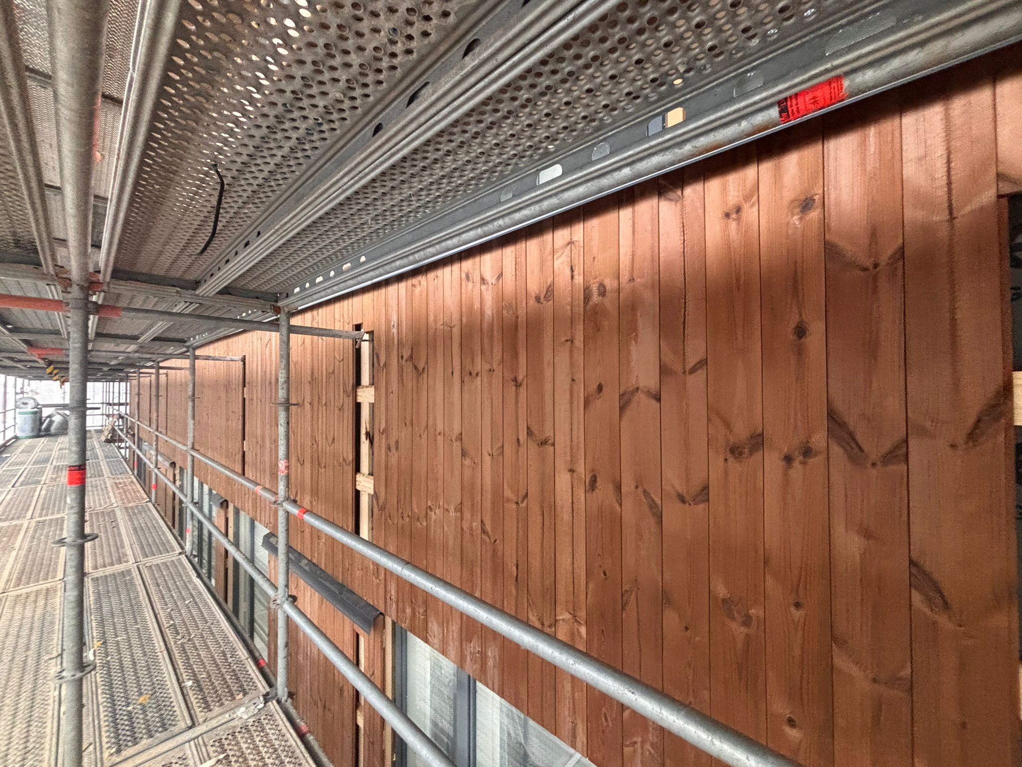Vaipan ulkopuoliset työt vesikaton ja julkisivun osalta ovat edenneet pohjahuovan asennukseen sekä julkisivupanelointiin.
