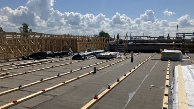 Työmaalle tiensä löytäneet kattoristikot ovat yhä jatkaneet matkaansa C-lohkon katolle. Myös höyrynsulkukermien asennukset ovat alkaneet vauhdikkaasti.