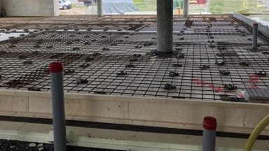 A-lohkon ensimmäisen maanvaraisen lattian raudoitustyöt ovat käynnissä.