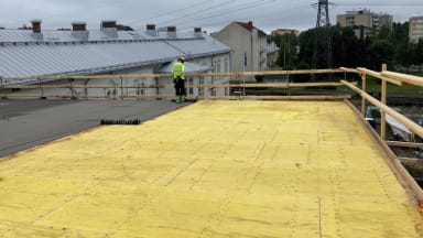 Alushuovan asennukset ovat käynnissä C-lohkon vesikatolla.