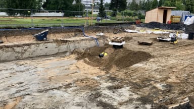 Aiemmin työmaan parkkipaikkana toimineella alueella tehdään nyt maatöitä, ja rakennekerrosten teko on käynnissä. Maamassan joukosta pilkistää myös öljynerotussäiliö.