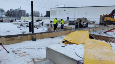 B-lohkolla väestönsuojatilojen ja samalla työmaan ensimmäisten lattioiden valu lähestyy. Eristeet on asennettu ja raudoitusverkotkin löytäneet suurimmaksi osin paikkansa. Eristeiden päälle sataneen kevyen lumipeitteen poistaminen on saatu kätevästi hoidettua lehtipuhaltimella. Joitain asennuksia on kuitenkin vielä tehtävänä ennen ensi viikon torstaina tapahtuvaa lattiavalua