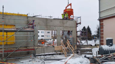 "Joka päivä valetaan", se oli tavoite kun perustustöitä alettiin tekemään ja osaavan urakkaporukan ja työnjohdon ansiosta siinä ollaan pysytty, yksittäisiä päiviä lukuunottamatta.Tälle viikkoa aloitettiin seinien valu C-lohkolta ja useampi pätkä onkin jo valmiina. Talviolosuhteiden takia työmaalla on käytössä Perin lämmitettävät järjestelmämuotit, joiden sisäpinnassa on nimensä mukaisesti lämpenevä pinta.
