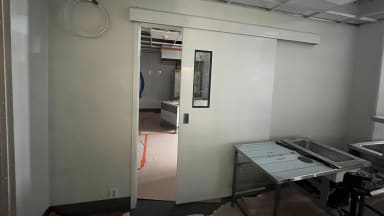Tällä viikolla on koululla käynyt tohina. 1.kerrokseen on asennettu paljon erilaisia ovia. Keittiön, ja keittiön tarjoilutilan väliin saatiin liuku-ovet. Keittiöön asennettiin myös sälerullaovet, jotka voidaan laskea alas ja lukita, kun keittiö ei ole käytössä.
