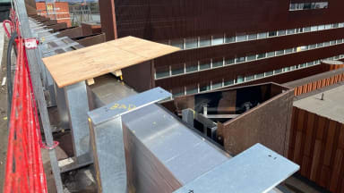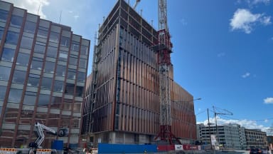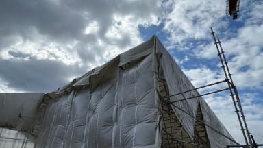 Sääsuojaa puretaan 7. kerroksen vesikaton päältä.