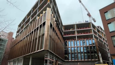 Alemmaksi jäävän osan runkotyöt ovat valmiit. Seuraavaksi alemman osan katolla alkavat vesikattotyöt sääsuoja-asennuksella.