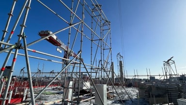 Elementtiasennus etenee 9. kerroksesta, josta näkee jo pitkälle Helsinkiin.